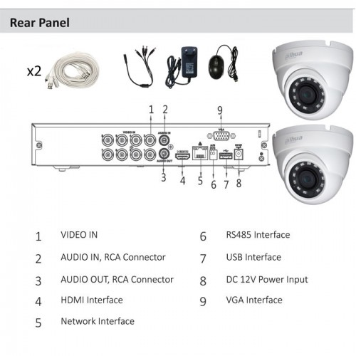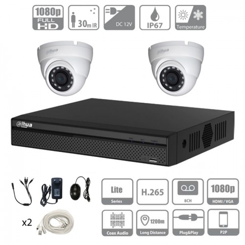 Ce kit de vidéo surveillance Dahua comprend 2 caméras dômes de 2 mégas pixel et un enregistreur BNC Dahua 4 voies.